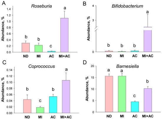 Effect of minocycline administration (MI) and acetate supplementation (AC) on the gut microbiota in 12-week-old male progeny: genus level relative abundance of (A) Roseburia, (B) Bifidobacterium, (C) Coprococcus, and (D) Barnesiella (n = 7–8/group). The letters a, b, and c above the bars denote significant differences between groups (p < 0.05, one-way ANOVA). ND = rats received vehicle (control); MI = rats received minocycline; AC = rats received acetate; MI + AC = rats re-ceived minocycline and acetate administration.
