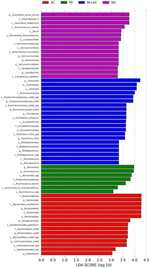 Results for the linear discriminant analysis effect size (LEfSe) algorithm to identify statistically significant biomarkers among groups are depicted in Figure 6. Minocycline administration caused a higher genus level of Barnesiella in the MI group. Acetate supplementation resulted in a higher proportion of genus Odoribacter in the AC group. Additionally, LEfSe analysis identified a higher abundance of genera Bifidobacterium and Turicibacter in the MI + AC group.