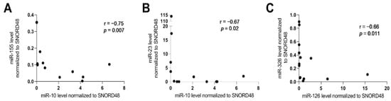 2.5. miRNA Expression Levels in Serum and Correlation between Cytokine Levels