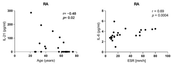 - Rasmussen, T.K.; Andersen, T.; Hvid, M.; Hetland, M.L.; Hørslev-Petersen, K.; Stengaard-Pedersen, K.; Holm, C.K.; Deleuran, B. Increased interleukin 21 (IL-21) and IL-23 are associated with increased disease activity and with radiographic status in patients with early rheumatoid arthritis. J. Rheumatol. 2010, 37, 2014–2020. [Google Scholar] [CrossRef] [PubMed]