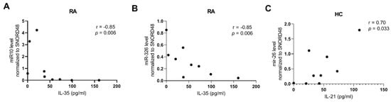 Paradowska-Gorycka, A.; Wajda, A.; Rzeszotarska, E.; Kmiolek, T.; Stypinska, B.; Dudek, E.; Romanowska-Prochnicka, K.; Syrowka, P. miR-10 and Its Negative Correlation with Serum IL-35 Concentration and Positive Correlation with STAT5a Expression in Patients with Rheumatoid Arthritis. Int. J. Mol. Sci. 2022, 23, 7925. https://doi.org/10.3390/ijms23147925