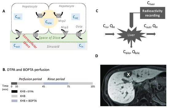 (A) BOPTA enters hepatocytes through the rat organic anion-transporting polypeptides (Oatps) and exits from hepatocytes into the bile canaliculi through the multidrug-resistance-associated protein 2 (Mrp2) and back into the sinusoids through Mrp3/4. (B) Two imaging substrates, DTPA and BOPTA, are subsequently perfused in isolated rat livers. DTPA distributes within the extracellular space (sinusoids and space of Disse), while BOPTA distributes into the extracellular space, hepatocytes, and bile canaliculi. Both substrates were diluted in a Krebs–Henseleit bicarbonate (KHB) solution. (C) Portal vein was perfused with 200 µM BOPTA (Cin) at a liver flow rate (QH) of 30 mL/min. In the common bile duct, BOPTA concentrations (Cbile, µM) and bile flow rates (Qbile, µL/min per liver) were measured. During the perfusion period, BOPTA concentrations in hepatic veins (Cout, µM) were concentrations that did not enter hepatocytes plus concentrations that entered hepatocytes before returning to the sinusoids. During the rinse period, Cout are concentrations leaving hepatocytes because no BOPTA was perfused. DTPA and BOPTA liver concentrations were measured with a gamma counter placed over a liver lobe. (D) BOPTA characterises focal lesions in humans. BOPTA enters normal human hepatocytes (white areas) while BOPTA is not present in the tumour (black area, white cross) because they do not possess uptake transporters. Gadopentetate dimeglumine (DTPA; Magnevist®; Bayer imaging) and gadobenate dimeglumine (BOPTA, MultiHance®; Bracco Imaging).
