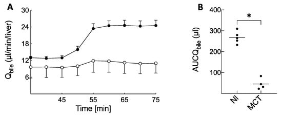(A) Bile flow rates (Qbile) during BOPTA perfusion (45 to 75 min). Livers were perfused with Krebs–Henseleit bicarbonate solution (KHB) + 200 µM [153Gd]BOPTA. Normal liver (Nl, black circles) and MCT livers (white circles). (B) Area under the curve of Qbile (AUCQbile) increase during BOPTA perfusion. * p = 0.02.