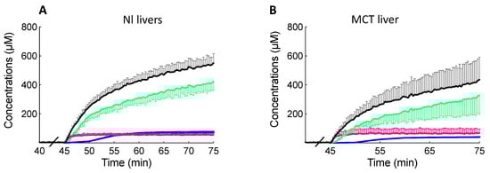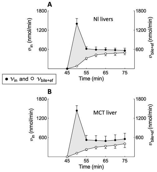 The accumulation profile of BOPTA concentrations in hepatocytes relied on the concomitant influx rates (vin, nmol/min) and efflux rates (vbile+ef, nmol/min). vin over time was not significantly different in MCT and Nl livers (Figure 4 and Table 1). In contrast, bile excretion rates (vbile) over time were significantly lower in MCT than in Nl liver (p < 0.0001, Table 1). In contrast, efflux rates into sinusoids (vef) were significantly higher in MCT than in Nl livers (p < 0.0001, Table 1). In both groups, influx rates were higher than total efflux rates (Figure 4, grey area), and the difference was low at the end of the perfusion period.