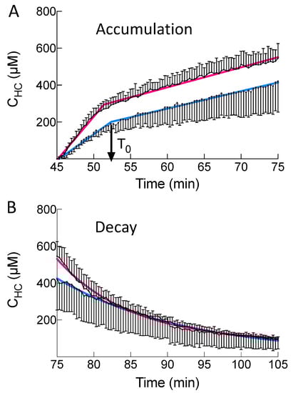 (A) Accumulation of BOPTA hepatocyte concentrations from 45 to 75 min. Accumulation was best described by a segmental linear regression (red curve for normal livers and blue curve for MCT livers. T0 (black arrows) was the time when BOPTA cellular efflux started to decrease hepatocyte concentrations. T0 was similar in both groups. (B) BOPTA concentration decay during the rinse period from 75 to 105 min, when livers were perfused only with the Krebs–Henseleit bicarbonate solution. Hepatocyte decay was best described by a one-phase decay (red curve for normal livers and blue curve for MCT livers).