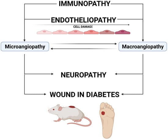 The source of impaired wound healing in DM is related to several overlapping mechanisms, presented in Figure 1. Endotheliopathy, which results in micro- and macrovascular changes, can lead to neuropathic changes, which significantly increase the risk of injury and delay in wound healing [4]. Macroangiopathic lesions, which usually occur later than microvascular changes, affect the supply of nutrients to the wound during vascular complications in DM. Importantly, although the studies investigating microvascular complications of DM, such as diabetic retinopathy, diabetic nephropathy and neuropathy, have used various animal models (e.g., streptozotocin or alloxan-induced DM in mice and rats, DM induced by transgenic procedures as in Akita mice), the mechanism leading to microvascular complications (microangiopathy) and created in these models is the same—hyperglycemia and other important changes such as impaired immune response or altered intracellular pathways [5]. Investigations of macrovascular changes are focused on animal models of specific macrovascular lesions, e.g., myocardial infarction or stroke. At a certain stage of the development of microangiopathic and macroangiopathic wound progression, revascularization is the only chance for wound healing. As yet, no vascular surgery techniques have allowed the restoration of the flow in microcirculation vessels (known as resistance subcutaneous arteries) due to the mostly irreversible nature of vessel wall remodeling and thrombotic and embolic closure. Firstly, the aim of the current studies should be to find optimal and possibly non-invasive assessment methods for the flow in the microvascular bed. This is extremely important when the changes in small arteries are potentially reversible, before significant thickening of the basement membrane and thrombotic and embolic occlusions occur. New MRI-based techniques used in preclinical studies on cerebral microcirculation in rodents might also be useful in diabetic wound studies [6]. Secondly, searching for microvascular revascularization methods and/or molecules and drugs preventing the occurrence of thrombotic and embolic changes and basal membrane thickening should be independent research directions [7,8]. Studies on both of these problems require designing an adequate animal model of wounds in DM, which will imitate impairment related to DM.