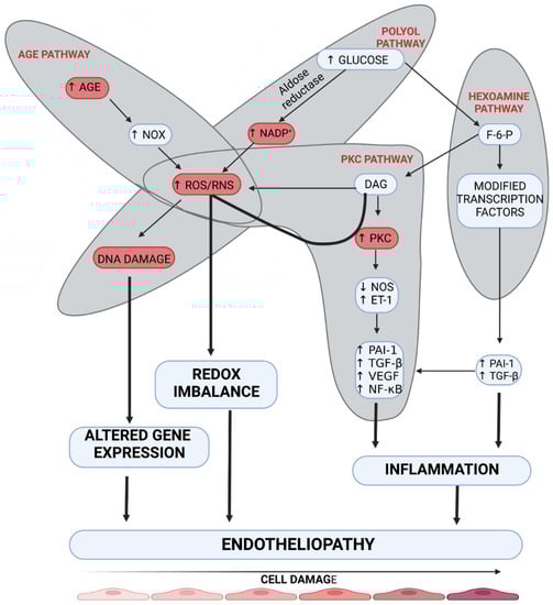 Figure 2. The mechanism of the development of endotheliopathy. Four main pathways are involved in the damage to endothelial cells (AGE pathway, polyol pathway, PKC pathway, and hexosamine pathway). Overactivation of these molecular pathways leads to inflammation, redox imbalance, and altered gene expression, which results in endotheliopathy. AGE—advanced glycation end-product, DAG—diacylglycerol, DNA—deoxyribonucleic acid, ET-1—endothelin-1, F-6-P—fructose 6-phosphate, NADP+—nicotinamide adenine dinucleotide phosphate, NF-κB—nuclear factor kappa-light-chain-enhancer of activated B cells, NOS—nitric oxide synthase, NOx—nitrogen oxides, PAI-1—plasminogen activator inhibitor-1, PKC—protein kinase C, RNS—reactive nitrogen species, ROS—reactive oxygen species, TGF-β—transforming growth factor β, VEGF—vascular-endothelial growth factor. Created with BioRender.com.