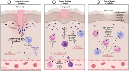 Figure 3. The mechanism of wound healing and impairment related to DM and hyperglycemia. (1) Immune response activation—the presence of pathogens, which enter through the damaged epithelium, leads to activation of innate immune response and secretion of inflammatory cytokines. (2) Wound healing process—secreted cytokines stimulate WBC diapedesis; macrophages and monocytes secrete substances which lead to re-epithelialization and ECM production and remodeling. (3) Wound healed with delay—the impaired physiological processes related to wound healing in diabetes result in the presence of thinner epithelium and an increased risk of infection. CX3CL1-chemokine (C-X3-C motif) ligand 1, DM—diabetes mellitus, FGF—fibroblast growth factor, ICAM-1—intercellular adhesion molecule 1, IL—interleukin, MCP-1—monocyte chemoattractant protein-1, MMP—matrix metalloproteinase, TIMP—tissue inhibitor of metalloproteinase, TLR-2—toll-like receptor 2, WBC—white blood cells, VCAM-1—vascular cell adhesion molecule-1. Created with BioRender.com.