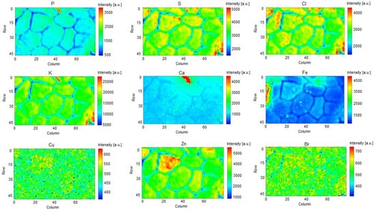 The elemental intensity maps (Figure 1) show that the spatial distribution of elements in the muscle fibres is very heterogeneous, which can have a large impact on the performed analyses. For this reason, the fibres that were partially outside the scanning area were excluded from the statistical analysis. The overall dataset included 135 isolated and irregular fibres, for which 11 elements were analysed in each fibre. For the muscle fibres thus selected, the values of the normalised peak areas of each element were used in further statistical analysis. First, the data were evaluated using the Shapiro–Wilk test to check their agreement with the normal distribution. Based on the obtained results, it was found that the data did not show normal distribution. Therefore, the further statistical analysis was based on non-parametric tests.