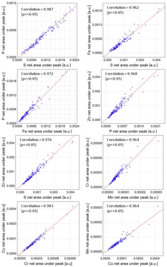 For all analysed elements (without separation into types), the cross-correlation was checked using the Spearman correlation analysis (Figure 2). All the obtained correlation coefficients were considered statistically significant if the parameter p had a value < 0.05. A surprisingly large part of the elements showed a very strong linear relationship with a correlation coefficient value above 0.9. All the relationships turned out to be positive, indicating overlapping elevated concentrations. The strongest dependence (value above 0.95) was shown by paired elements, such as P and S, P and Fe, P and Zn, S and Fe, S and Zn, Mn and Cr, Cr and Cu and Cu and Mn.