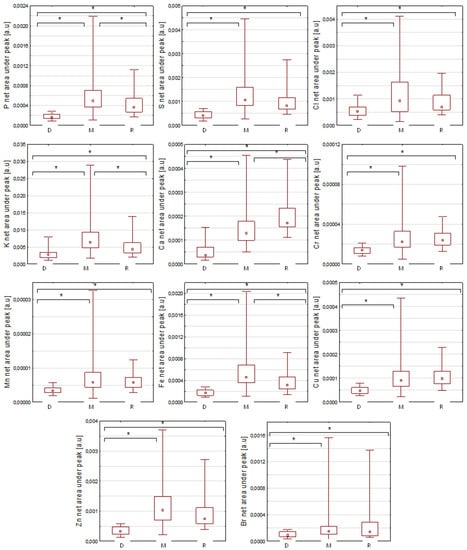 Box plots from the Kruskal–Wallis test for the individual elements (median, ±0.25–0.75% percentile and min–max values). Abbreviations: *—p < 0.05; D—dystrophies group; M—myopathy group; R—reference group.