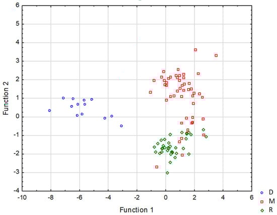 For the first function, the greatest influence on the components was from P and Ca, while for the second function, the greatest influence was from K and Cr. The graphic representation of data distribution in the space of discriminate functions is presented in Figure 4.
