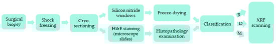 The tissue material used in this study was obtained from surgical biopsies from patients with suspected muscle changes and then processed according to the standard neuropathological protocol used for muscle biopsy at the Department of Neuropathology at Jagiellonian University Medical College in Krakow (DN JUMC). The biopsy specimen being used for elemental micro-imaging was oriented on a holder to cut it in the plane strictly perpendicular to the long axis of the muscle fibres and then shock-frozen in isopentane previously cooled in liquid nitrogen. The muscle tissues prepared in this way were cut into slices of 8 µm thickness using a cryomicrotome at −20 °C. Samples intended for the elemental analysis were placed on silicon nitride windows (thickness: 200 nm; size: 2 × 2 mm2) (Norcada, Canada), while adjacent consecutive tissue slices were placed on microscope slides and stained with haematoxylin and eosin (H&E) for further histopathological examination. The samples prepared on the silicon nitride windows were freeze-dried at −80 °C. A schematic overview of the sample preparation protocol is presented in Figure 5. All the cases studied were diagnosed histopathologically in DN JUMC. The research was approved by the Jagiellonian University Medical College Ethics Committee (approval number: 1072.6120.249.2020).