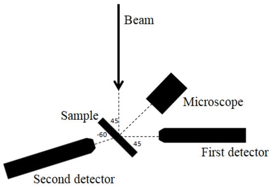 The experiment was carried out at the I18 beamline at the DIAMOND Light Source. The beam size was shaped to the 5 × 5 µm2 size by the Kirkpatrick–Baez mirrors. The excitation energy was 13.5 keV. The recorded maps had different sizes depending on the number of measured fibres and their distribution. The scan step was 5 µm. The acquisition time of 4 s per pixel has been used. To detect the characteristic radiation two four-segment Vortex ME-4 SSD detectors were used—one in front of the sample at 45/45 deg geometry and one behind the sample at 45/−60 deg geometry (Figure 6). All measurements were performed in a helium atmosphere.