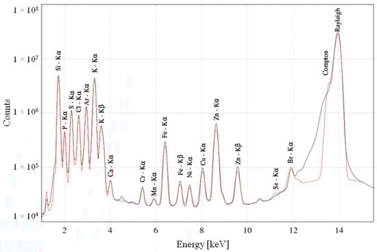 The spectrum of characteristic X-ray radiation of a selected fibre from the reference group. The measured spectrum is marked with the black line, and the red line shows the fit by the PyMca program.