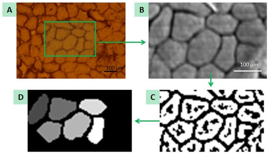Graphical representation of steps needed to obtain the mask from an ROI image by binarisation: (A) a photo of the sample taken with an optical microscope with the marked area of measurement; (B) ROI image; (C) ROI image binarisation; (D) created mask.