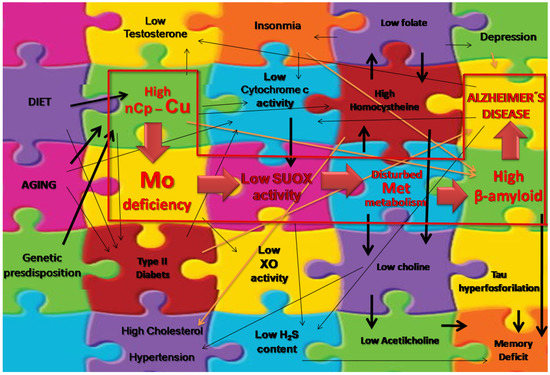 As previously mentioned, in individualswith a predisposition towards AD the content of nCp–Cu in serum increases due to aging [36], which possibly causes greater Mo demands or its deficiency. One strong indication for this is the low content of molybdoenzyme products in AD [7,56,86,87,88,89]. In addition, there is an interaction of deficient Mo with disturbed S metabolism in AD [57,105].