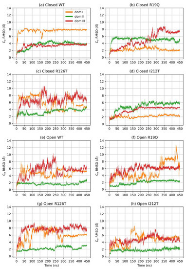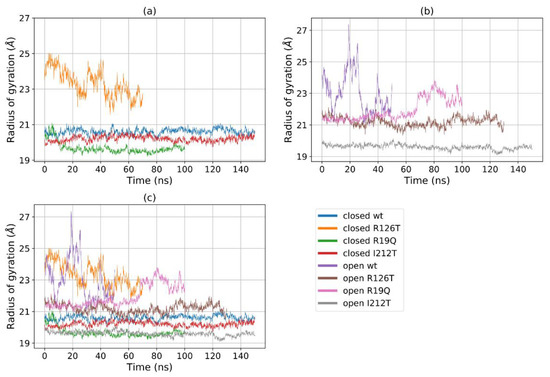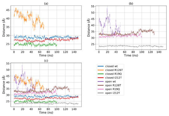 Figure 5a shows that for most structures the radius of gyration, at least in the closed states, is stable in the range 19–22 Å, with the notable exception of R126T, whose radius of gyration (Rg) even in the closed state oscillates between 21 and 27 Å. In addition, the open WT conformation displays a high value of Rg, as the open R19Q whose Rg value increases at about 60 ns of the supposed production run. These results are comparable, although to a smaller extent, to the results obtained by Gijsbers et al. [23], who analyzed an ensemble of yeast SBDS conformations that comprised a ‘compact’ conformation with an Rg of 24 Å, a ‘stretched’ one with an Rg of 28 Å and a ‘relaxed’ conformation with an Rg of 30.4 Å. In the present case, the ‘compact’ conformation is analogous to the closed state, while the ‘stretched’ is similar to our open state. These results confirm our previous observation, that some mutations alter the population of the closed/open forms towards an intermediate state. In particular, the closed R126T has characteristics shared by the pool of open systems, while the open I212T, assuming the most compact conformation, may be connected more to a closed state rather than an open state. This tendency is confirmed by the analysis of the mutual domain distances (Figure 6). The mutual distances between domains I and II for the closed R126T are more similar to those of open structures, while the values of the open I212T are quite different from the other open structures and more similar to the values obtained for closed systems (Figure 6a); this difference is better appreciated in Figure 6b,c. This observation adds to previous comments about the similarity of the closed R126T to open structures and the similarity of open I212T to closed structures. A comparison of the closed R126T and the open WT conformations reveals that the mutual distance between domains I and III and Rg are very similar. This may indicate that the Rg variation for these systems can be explained by the relative motion of these two domains. All other structures display stable and lower distances. The open R19Q has a constant value of the distance between domain I and domain III over time, so in this case, the variation in Rg is not related to the distance between domain I and III, but rather to their lower stability.