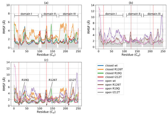 RMSF of C for closed (a) and open (b) structures: WT, R126T, R19Q, I212T. The gray areas indicate the three domains of SBDS: domain I, C1-97; domain II, C 109-170; domain III, C175-252. Red vertical lines point out the mutated residues in position 19 (21 in reference PDB) in domain I, 126 (128 in reference PDB) in domain II and 212 (214 in reference PDB) in domain III. (c) RMSF for C of all systems (lower horizontal bars indicate different domains).