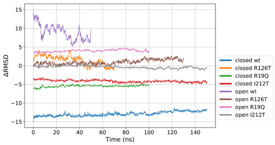 where are the coordinates of atom i at time t, N is the number of atoms (alpha carbons), are the coordinates of atom i in the first frame of the closed WT production run and are the coordinates of atom i in the first frame of the open WT production run. With this approach, we obtained a value of ∆RMSD ranging from −15 to +15: a negative value implies that the structure closely resembles the WT closed conformation, while a positive value would denote a close similarity with the WT open conformation. Values close to zero account for intermediate situations. Figure 4 clearly demonstrates that the wild-type systems occupy by definition the extremes of the plot, being the reference for closed and open structures. Most of the proteins display a stable value of ∆RMSD, meaning that transitions between the two conformations are not observed within the production runs here examined. The low values for the open I212T conformation qualify this mutant as a candidate for an intermediate form between the closed and open state. An interesting behavior is observed for the case of the closed R126T which displays positive values of ∆RMSD in the initial part of the production run but drifts towards the zero value that would correspond to an intermediate state. Again, this clearly indicates that this mutation affects the stability of the closed conformation. However, this analysis suggests that all the investigated mutations tend to produce an intermediate state between the WT open and closed structures.