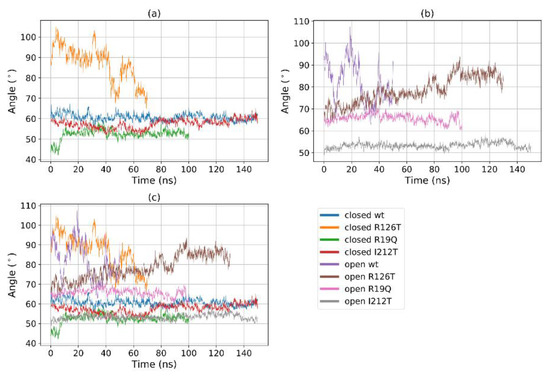A further assessment of domain motions can be obtained by considering the angle formed by the vectors that join the center of geometry of domain II with the centers of the geometry of the other two domains. This angle can be also directly measured: for instance, in yeast SBDS, the ‘compact’ conformation was characterized by an angle of 95°, while the ‘stretched’ one was characterized by an angle of 112° [23]. In our analysis, this angle is stable throughout the trajectory for most structures, with values ranging from 50° to 70° (Figure 7). However, again the closed R126T and open WT single out with a highly fluctuating value that exceeds 100°, consistently with the Rg-based investigation. We remark, however, that the values found in this computational investigation differ from the reported experimental ones, as reported in ref. [23]. In our case, it is not easy to assess the difference between the angles for the closed and open conformations since this value oscillates wildly around 75° for the open WT, while it remains constant at around 60° for the closed WT (Figure 7b). We may therefore conclude that, although the quantitative values differ, the qualitative behavior is consistent with the reported experimental data, and, again the mutant I212T tends to adopt dynamics that closely resemble the closed WT state, while the mutant R126T displays a clear tendency towards the open WT state.