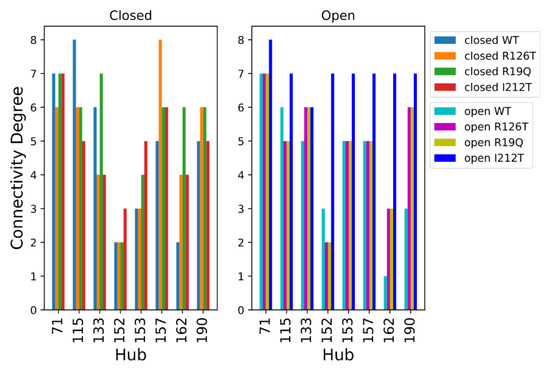 The analysis of hubs for the PSNs of the wild type and mutated structures is shown in Figure 9, where the residues were considered hubs if they had a connectivity degree higher than 6 in at least one of the eight systems. Looking at the hubs of networks of closed systems, only 4 residues (aa 73, 117, 135, 159) display a connectivity degree higher than 6 in at least one of the four systems. The PSNs of open structures present a higher number of hubs with connectivity degree higher than 6 in at least one of the four systems, namely residues 73, 117, 154, 155, 159, 164 and 192. However, most of the selected hubs (except residue 73) had a high connectivity only in the open I212T PSN, while the connectivity degree was much smaller in other cases. Comparing these results obtained for closed and open systems, we can say that residue 73 is an important hub in all the considered networks and that the open I212T conformation has a higher connectivity with respect to the other open structures.