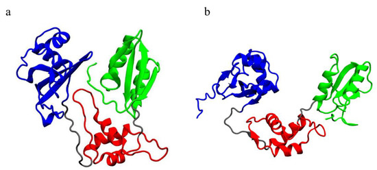 Visualization of the equilibrated trajectories: (a) closed WT and (b) open WT. Different colors indicate different domains: blue, domain I; red, domain II; green, domain III; grey, linkers. The C-terminal domain is clearly in contact with both domains I and II in the closed conformation.