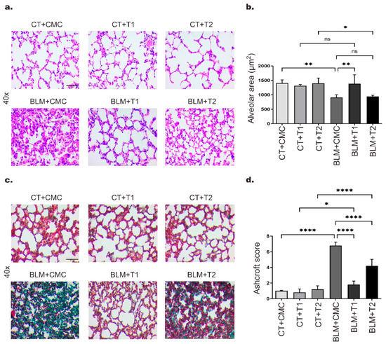 3′5-DMBA attenuates BLM-induced pulmonary fibrosis in mice. Mice in BLM groups were instilled with an osmotic minipump loaded with BLM 100 U/kg. Mice in control groups (CT) have a sham instillation. On day 14, mice received either 3′5-DMBA or its vehicle intragastrically until they were euthanized on day 28. (a) Sections of lung tissue stained with H&E; (b) bar graph showing H&E staining analysis of alveolar area size made using ImageJ software; (c) Masson’s trichrome staining of lung tissue showing collagen fibers in green; (d) Bar graph showing the Ashcroft scale score for all groups. CT+CMC: control group, BLM+CMC: BLM-treated group, BLM+T1: BLM plus 3′5-DMBA-treated group at a dose of 6 mg/kg, and BLM+T2: BLM plus 3′5-DMBA-treated group at a dose of 10 mg/kg. Representative images were taken at 40× magnification. Scale bar = 50 μm. Data are represented as the mean ± SD (n = 4). Data were analyzed by one-way ANOVA followed by Tukey’s t-test for comparison between groups. For each graph, the asterisks above the horizontal lines indicate significant differences with respect to their control groups and differences between the two doses and the vehicle. * p < 0.05, ** p < 0.01, and **** p < 0.0001. BLM: bleomycin, CMC: carboxymethylcellulose (vehicle), and 3′5-DMBA: 3′5-dimaleamylbenzoic acid.