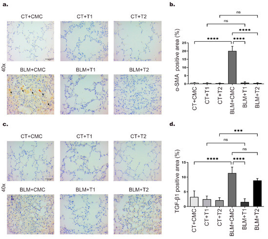 Proliferation, activation, and differentiation of fibroblasts to myofibroblasts are early events in tissue repair and contribute to IPF development [2]. To evaluate the effect of 3′5-DMBA on lung fibrogenesis, we performed immunohistochemical analysis for α-SMA, a recognized marker of myofibroblast activation. In immunohistochemical assays, the positive area is observed in brown gradients. Our results showed that after BLM treatment, α-SMA expression increased up to 19.5-fold in the BLM+CMC group relative to the CT+CMC group, whereas it decreased 19.4 and 19.42-fold, respectively, in the BLM+T1 and BLM+T2 groups compared to the BLM+CMC group (Figure 2a,b). Critical events in fibrogenesis, such as myofibroblast activation, are primarily orchestrated by TGF-β1, the major profibrotic cytokine [12]. Immunohistochemical staining for TGF-β1 showed that in the BLM+CMC group, its expression was increased up to 7.6-fold compared to the CT+CMC group. In contrast, the BLM+T1 group showed a 9.3-fold decrease in TGF-β1 expression relative to the BLM+CMC group (Figure 2c,d). The attenuation effect of TGF-β1 in the BLM+T2 group was 3.3-fold that in the BLM+CMC group. These results suggest that treatment with 3′5-DMBA can decrease the expression of pulmonary fibrosis-related proteins in a concentration-dependent manner, thus exerting an antifibrotic effect.