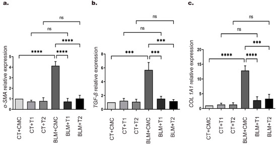 3′5-DMBA modulates gene expression related to BLM-induced lung fibrosis in mice. Mice in BLM groups were instilled with an osmotic minipump loaded with BLM 100 U/kg. Mice in control groups (CT) have a sham instillation. On day 14, mice received either 3′5-DMBA or its vehicle intragastrically until they were euthanized on day 28. The mRNA levels of (a) α-SMA; (b) TGF-β1, and (c) COL1A1, were determined by real-time quantitative PCR (RT-qPCR) in mouse lung tissue. CT+CMC: control group, BLM+CMC: BLM-treated group, BLM+T1: BLM plus 3′5-DMBA-treated group at a dose of 6 mg/kg, and BLM+T2: BLM plus 3′5-DMBA-treated group at a dose of 10 mg/kg. Data are represented as the mean ± SD (n = 4). Data were analyzed by one-way ANOVA followed by Tukey’s t-test for comparison between groups. For each graph, the asterisks above the horizontal lines indicate significant differences with respect to their control groups and differences between the two doses and the vehicle.*** p < 0.001, and **** p < 0.0001. BLM: bleomycin, CMC: carboxymethylcellulose (vehicle), and 3′5-DMBA: 3′5-dimaleamylbenzoic acid.