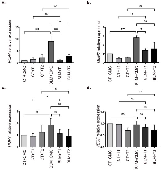 Moreover, myofibroblast accumulation in the interstitial space drives ECM accumulation mediated by dysregulation between matrix metalloproteinases (MMPs) and their inhibitors (TIMPs) [30]. Therefore, to evaluate the effect of 3′5-DMBA on MMPs and TIMPs, we assessed the expression of MMP2 and TIMP2 genes reported to be related to this process. Our results showed that MMP2 expression in the BLM+CMC group increased up to 1.8-fold compared to the CT+CMC group, whereas this expression was reduced 1.4-fold in the BLM+T1 group after 3′5-DMBA treatment relative to the BLM+CMC group. However, the BLM+T2 group did not show significant changes in MMP2 expression as compared to the BLM+CMC group (Figure 4b). For the TIMP2 gene, no significant differences were observed in any of the BLM-treated groups relative to their control groups (Figure 4c).