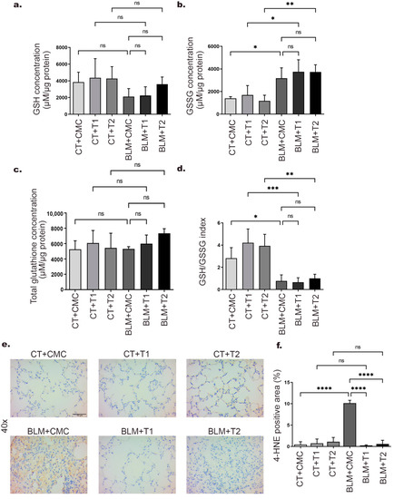 In addition, lipid peroxidation (LPO) is an OS consequence and is causally associated with the development of IPF [14]. Our previous results show that 3′5-DMBA does not decrease BLM-induced OS. Therefore, in order to evaluate the effect of 3′5-DMBA on lipid damage, immunohistochemical staining for 4-HNE as a by-product of LPO was performed. Our results show that after BLM treatment, 4-HNE expression increased 9.7-fold in the BLM+CMC group relative to their control CT+CMC group. After 3′5-DMBA treatment, 4-HNE expression in the BLM+T1 and BLM+T2 groups decreased 9.9 and 9.5-fold compared to the BLM+CMC group (Figure 5e,f). Therefore, taken together, these results suggest that although 3′5-DMBA cannot rescue from BLM-induced OS, it does not promote LPO increase.