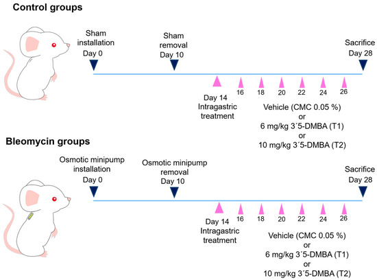 Mice were randomly divided into six groups with four mice each: three control groups (CT) and three bleomycin groups (BLM). Mice in the BLM groups were maintained under isofluorane anesthesia and instilled with an osmotic minipump (ALZET Durect, 1007D, Cupertino, CA, USA) loaded with BLM 100 U/kg (BLOMINDEX, Pisa, Guadalajara, Mexico) subcutaneously in the scapular area as previously reported [56]. Defining the day of BLM administration as day 0. Mice in the CT groups had sham instillation. On day 10, the osmotic minipump was removed from mice in BLM groups, while the control groups had a sham removal. On day 14 post-instillation, 3′5-DMBA at 6 mg/kg (T1) or 10 mg/kg (T2) was intragastrically administered in CT+T1 and BLM+T1 or CT+T2 and BLM+T2, respectively. The corresponding volume of carboxymethyl cellulose 0.05% (CMC) vehicle was administered intragastrically in the CT+CMC and BLM+CMC groups. Intragastric treatments were administered every two days until day 26. On day 28, all mice were euthanized under anesthesia (Figure 6).