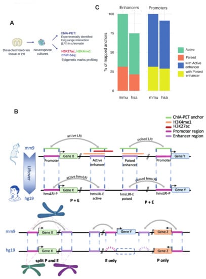 We sought to identify, within the human genome, DNA regions syntenic with the long-range interactions (LRI) previously identified by RNApolII-ChIA-PET in mouse NSC, connecting gene promoters with distal “epigenetic enhancers”, i.e., regions marked by H3K4me1 and H3K27Ac [,] (Methods) (Figure 1A). We first identified, within mouse LRI, the “non-promoter” interaction anchors [] carrying epigenetic enhancer marks. “Anchors” are defined as DNA regions, identified by RNApolII-ChIA-PET to interact with distant DNA regions; “Promoter anchors” contain a gene promoter, “non-promoter” anchors do not []. We distinguished between regions carrying both H3K27Ac and H3K4me1 (“active enhancers”) and regions carrying H3K4me1 only (“poised enhancers”, representing enhancers that were proposed to become fully active following cell differentiation) [,] (Figure 1B; Methods). We reciprocally mapped mouse enhancers and promoters of each LRI to their syntenic human regions by the Liftover tool (see Methods); we termed these human regions human–mouse syntenic long-range interaction regions (“hmsLRI”). We further distinguished within the hmsLRI the sequence homologous to the mouse epigenetic enhancer sequence (i.e., carrying active or poised enhancer marks); we term these sequences Enhancers within hmsLRI (hmsLRI-E) and hmsLRI-E-a (active) or hmsLRI-E-p (poised) according to the epigenetic marks (Figure 1B; Table 1). Promoters, as they are more conserved, showed a higher percentage of continuous overlap than enhancers, as the latter regions most often encompass intergenic and intragenic regions so they are less likely to be completely conserved in humans (Figure S1). Overall, out of 10,994 mouse LRI originally identified in [] (7554 involving active enhancers, and 3440 involving poised enhancers), 7698 LRI could be re-mapped onto the human genome regarding both the promoter and the enhancer (Figure 1B, “P+E”), with more than 50% of bases “lifted over” to the human genome; these represent about 70% (72.7% for active and 64.1% for poised, respectively) of the LRI originally identified in mouse (Table 1 and Table S1, Figure 1C). These human regions (promoter+enhancer, P+E), corresponding to the mouse LRI via Liftover, are the hmsLRI (Table 1, Figure 1B). Interestingly, for 33 mouse LRI (26 involving active and 7 involving poised enhancers), both enhancer and promoter could be re-mapped, but, in humans, the corresponding sequences were located on two distinct chromosomes (interchromosomal LRI in Table 1, Figure 1B, “split P and E”) implying a probable disruption of the mouse 3D chromatin interaction.