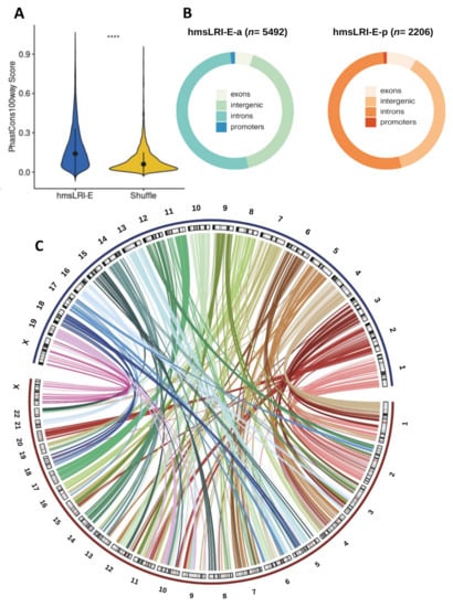 Subsequently, mouse LRIs for which both anchors were conserved in a syntenic region of the human genome were selected and called “hmsLRI” (Table 1). The identified human syntenic regions were annotated using the UCSC KnowGene track “TxDb.Hsapiens.UCSC. hg19.knownGene” [] distinguishing among exonic, intergenic, intronic or promoter (Figure 2B). Human syntenic enhancer regions were classified intragenic if they overlapped (1 bp min.) any gene coordinates (5′ UTR, exon, intron, 3′ UTR) while syntenic promoter regions were first checked for overlap with any promoter region (defined as ±2.5 kb of TSS). The conservation level for hmsLRI-E (enhancers involved in hmsLRI) was measured using UCSC phastCons conservation scores for the human genome (hg19) calculated from multiple alignments with 99 other vertebrate species and retrieved in R using Bioconductor package phastCons100way.UCSC.hg19 []. A set of random shuffled genomic regions with similar length and chromosomal distribution of hmsLRI were simulated using randomizeRegions() function of regioneR package (Gel, B. et al. (2015) [].