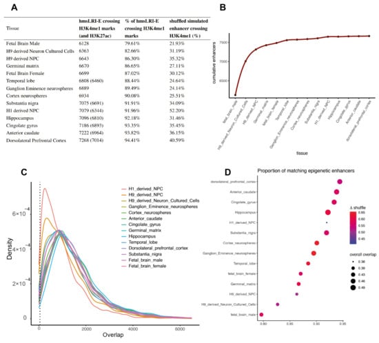 Concordance between hmsLRI-E and human DNA regions carrying epigenetic enhancer marks (H3K4me1; H3K27ac) from Roadmap Epigenomics. (A)—For each human neural tissue, the number of hmsLRI-E encompassing enhancer marks (H3K4me1; H3K27ac where available) and their relative percentages are shown. The values are compared with the % of shuffled enhancer-like regions overlapping H3K4me1 marks. (B)—Cumulative number of matched hmsLRI-E in all the tissues. On the x-axis, tissues are listed from the one with the lowest number of matching hmsLRI-E to the one with the highest number. The y-axis shows the cumulative number of unique hmsLRI-E that progressively match the epigenetic enhancer marks of the indicated tissue (the percentage for each tissue is added to the ones already found for the previous ones). (C)—Distribution of the extent of overlap (in base pairs, X-axis) between hmsLRI-E and human regions carrying epigenetic enhancer marks in human cells according to the Roadmap Epigenomic database (“Density” in the Y axis). The dotted line at 50 bp represents the cutoff below which the hmsLRI-E and the enhancer marks were not considered matched. (D)—Dot plot representing, on the X-axis, the proportion of hmsLRI-E overlapping human DNA regions (min 50 bp) carrying epigenetic enhancer marks in human neural cells (“matching epigenetic enhancers”), as previously defined in the Roadmap Epigenomic database, in the various tissues indicated on the Y-axis. The width of the dots represents the proportion of bp covered by the methylation region out of the total length of the matched hmsLRI-E. Color is dependent on the difference (delta) between the match of the hmsLRI-E with H3K4me1-marked regions and the match of the simulated shuffled enhancers, in terms of proportion.