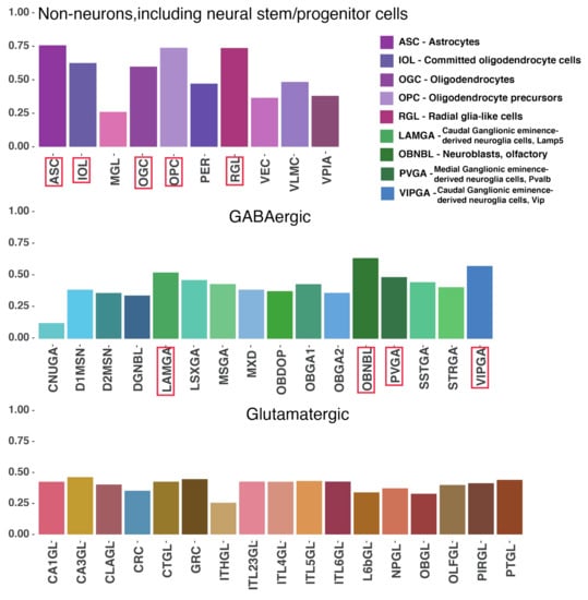 In a recent study, Li et al. [] identified a set of candidate cis-regulatory elements (cCRE) in the mouse genome, by combining single-nucleus assays for transposase-accessible chromatin (sn-ATAC-seq) and single-cell RNA sequencing (scRNA-seq), from more than 800,000 cells from 45 different regions of the adult mouse brain. They identified 491,818 cCRE within 160 distinct cell types. We compared our mouse enhancers, involved in LRI, to mouse cCRE. We found that more than 95% of our mouse enhancers (10,501 in over 10,994) overlap with cCRE (97.6% of the active enhancers, 7370 in over 7554, and 91% of the poised ones, 3131 in over 3440, respectively). Overall, they spanned all the 160 cell types with different levels of occurrence ranging from 12% to 78%. Accordingly, all 43 subclasses were present with variable fractions of enhancers overlapping with cCRE (12% to 76%, Figure 4). Remarkably, the most enriched cell types encompass Radial Glia-like Stem Cells (RGL, corresponding to the identity of our forebrain-derived cultured NSC), and other proliferating neural precursors (such as oligodendrocyte progenitor cells, OPC), but also many differentiated cell types within the in vivo brain (Figure 4). Interestingly, the most represented cell types include various types of GABAergic neuroblasts and neurons, as well as astrocytes (ASC) and oligodendrocytes (OGC) (Figure 4), which correspond to the cell types that our NSC generate upon in vitro differentiation [,,,]. Glutamatergic neurons, though present, are less represented (Figure 4).