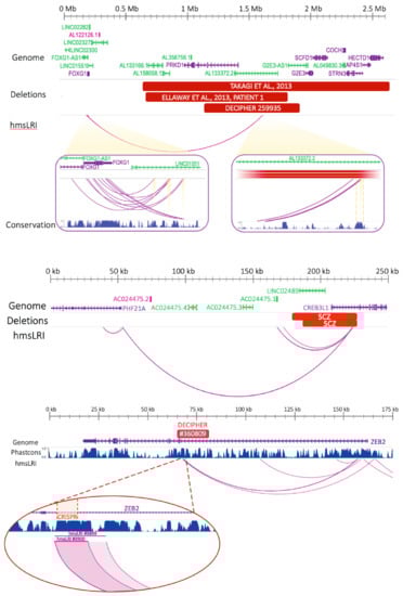 We then considered clinically relevant Copy Number Variants (CNV) identified in NDD cohorts with the aim of drawing a possible causal connection with the loss/gain of a copy of a DNA region involving hmsLRI. Indeed, there are reports of neural disease caused by genomic rearrangements affecting the regulation of specific genes, without altering their coding regions; it is possible that these rearrangements disrupt gene connections to their enhancers, or the enhancers themselves (see [,,,,] in relation to FOXG1, Bcl11a, Arid1A, AKT3).