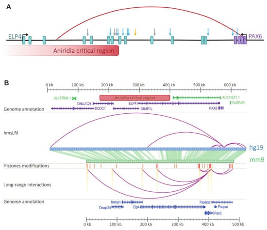 LRI connects PAX6 to multiple distal enhancers in the aniridia critical region. (A) Blue arrows represent enhancers active in ocular structures, grey ones denote enhancers active in other brain structures; in orange, the SIMO element identified by (Kleinjan et al., 2001; Kleinjan and van Heyningen 2005) [,]; the red arch connects PAX6 promoter to an hmsLRI-E. The aniridia critical region, chr11:31422424–31666340, encompasses our enhancer. (B) LRI involving the Pax6 promoter reported in (Bertolini et al., 2019) []; the track “histone modifications” shows regions carrying marks of poised (orange, H3K4me1) and active enhancers (red, both H3K4me1 and H3K27ac); highlighted LRI overlap with cCREs reported in (Li et al., 2021). In the upper part, long-range interactions, involving active or poised enhancers, present among our hmsLRI-E. Highlighted enhancers and promoters overlap with cCREs reported (Li et al., 2021) []. The middle panel is a representation of corresponding regions between the mouse (mm9) and human (hg19) genome.