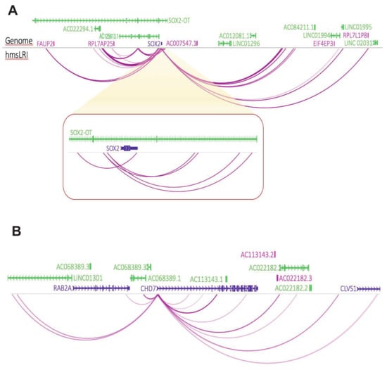 Our hmsLRI identified about 70 human genomic regions, harboring enhancers (hmsLRI-E), that are connected to eye disease-relevant genes in long-range interaction maps (Table S4). In particular, the SOX2 (Figure 8A), CHD7 (Figure 8B) and PAX6 (Figure 7B) genes display numerous long-range interactions connecting them to putative enhancers (Table S4). Further, this set of genes harbors several intronic epigenetic enhancers in mice, that are conserved in humans; in turn, the enhancers are connected to other gene promoters (Table S5). The LRI perspective proposes these enhancers as candidates for targeted sequencing in those patients with genetic eye defects (MAC-ONH), that did not yet receive a molecular diagnosis based on exome sequencing.
