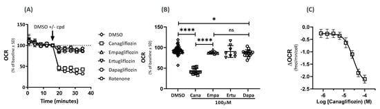 Effects of SGLT2 inhibitors on OCR. Effect of DMSO; DMSO + SGLT2 inhibitor (100 µM); cana, dapa, ertu, and empa on OCR and rotenone (2 µM) in (A) OCR as % average change from baseline and (B) OCR after 40 min (n = 16 (cana and dapa), n = 8 (ertu and empa), and n = 32 (DMSO); **** p < 0.0001, * p = 0.041, ns = not significant, n = replicates of samples). (C) ΔOCR for cana (n = 12).