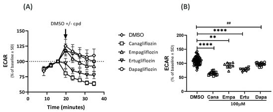Effects of SGLT2 inhibitors on ECAR. Effect of DMSO and DMSO + SGLT2 inhibitor (100 µM); cana, dapa, ertu and empa on (A) ECAR as % change from baseline (one experiment). (B) ECAR after 40 min (two independent experiments); **** p < 0.0001; ** p = 0.0021; ## p = 0.0026; n = 62 (DMSO), n = 16 (cana), 15 (dapa) and 8 (ertu and empa).