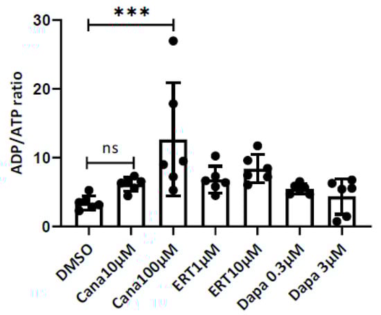 Effects of SGLT2 inhibitors on the ADP/ATP ratio. Effect of DMSO and DMSO + SGLT2 inhibitor on the ADP/ATP ratio in HUVECs at pharmacologically relevant and supra-pharmacological concentrations of cana (10 and 100 µM), dapa (0.3 and 3 µM), ertu (1 and 10 µM). *** p < 0.004, ns = not significant. Ordinary one-way analysis of variance (ANOVA).