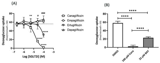 Both cana and ertu inhibited 14C-DOG uptake with IC50 values of 14 µM and 85 µM, respectively (Figure 4A). At 100 µM, dapa and empa showed weak, but significant, increases in 14C-DOG uptake (dapa: p = 0.0411; empa p = 0.0003), with IC50 values > 100 µM (Figure 4A). The GLUT1 inhibitor, BAY-876 (25 µM), inhibited 60% of the 14C-DOG uptake and cana (100 µM) inhibited 97% of the 14C-DOG uptake (Figure 4B).