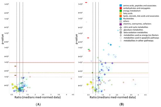ANOVA volcano plots for cana (10 µM)-treated (A) and cana (100 µM)-treated HUVECs (B). ANOVA exhibited significant differences between the control groups for 96 metabolites. Levels of metabolites on the left side of the black vertical line decreased; levels of metabolites on the right side of the black vertical line increased. Y-axis: p-values (inverse log scale); x-axis: metabolite ratios (median normalized data; simple treatment). Left black dotted vertical line: ratio of 0.8. Right black dotted vertical line: ratio of 1.2. The red horizontal line denotes a p-value of 0.01, the dashed orange horizontal line denotes a p-value of 0.05, and the gray horizontal line denotes a p-value of 0.1. Metabolites are colored according to the Human Metabolome Database classes []. Metabolites supplying the TCA cycle are marked with filled crosses; glycolysis metabolites by filled minus; metabolites used in beta-oxidation with filled circles; metabolites used as energy (co-)factors with filled stars; metabolites used in apoptotic pathways are marked with empty symbols and others with snowflake-like symbols.