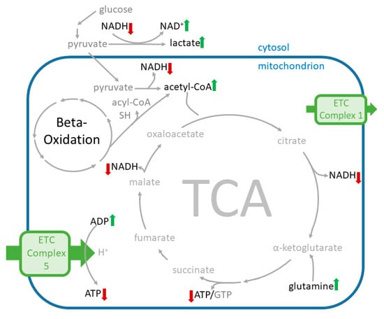A potential increase in the TCA-cycle activity could also have been caused by the increased activity of the electron transport chain complex II (ETC2), since ETC2 directly links the TCA cycle and the respiratory chain by catalyzing the oxidation of succinate to fumarate []. A potential increase in fatty acid oxidation could lead to heightened activity of the ETC2, as has been described by Pfleger et al. [].