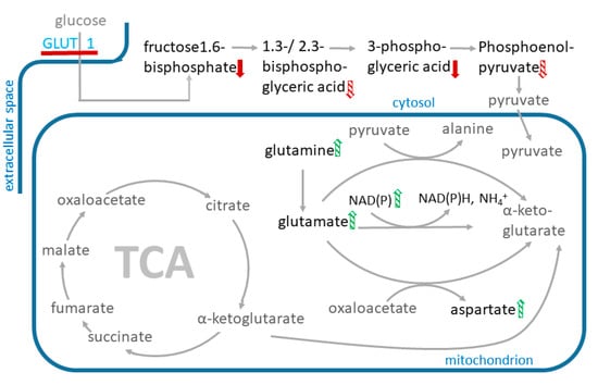 Scheme of affected metabolites and pathways in cana-treated HUVECs. Metabolite levels that were elevated after cana treatment are marked with a green up-arrow, metabolite levels lowered after cana treatment are marked with a red down-arrow. Metabolites that appear more than once in the graph are only marked once with an arrow. Significantly changed metabolite levels in cana (10 µM)- and cana (100 µM)-treated cells are marked with a filled arrow and metabolite levels that are significantly changed only in cana (100 µM)-treated cells are marked with a shaded arrow. The red line at the GLUT 1 transporter indicates transporter inhibition.