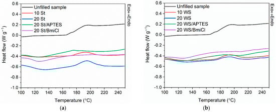 Compounds | Tg (°C) | ∆Cp (J/g × K) | Temperature of Crosslinking (°C) | ∆H (J/g) |