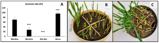 Survival rate at −10 °C after 3 days of recovery period at 20 °C (A). Representative photos demonstrating the survival of wheat genotypes (1: Mv Béres; 2: Rht-B1a; 3: Rht-B1b; 4: Rht-B1c) after 1-day freezing at −10 °C (B) and after −11 °C (C). Photos were taken after 3 (B) or 10 days (C) of the recovery period at 20 °C. ***: significant at p < 0.001 level.