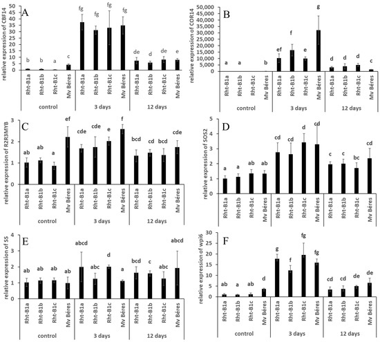 Effects of 3 or 12 days of cold hardening at 5 °C on the CBF14 (A), COR14b (B), R2R3MYB (C), SOS2 (D), SS (E) and wpi6 (F) genes in the leaves of different young studied ‘April Bearded’ genotypes and the Mv Béres variety. Control values represent data for unhardened plants. The relative gene expression was determined with the 2-ddCt method. Different letters indicate significant differences at the p ≤ 0.05 level.